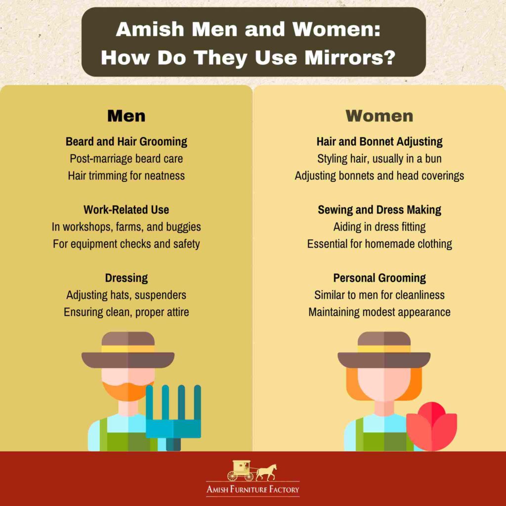 In Amish communities, where traditional gender roles and modesty are highly valued, there are distinct differences in how men and women use mirrors, reflecting their cultural norms and daily practices. These differences are based on the community’s emphasis on simplicity, modesty, and the distinct roles of men and women.