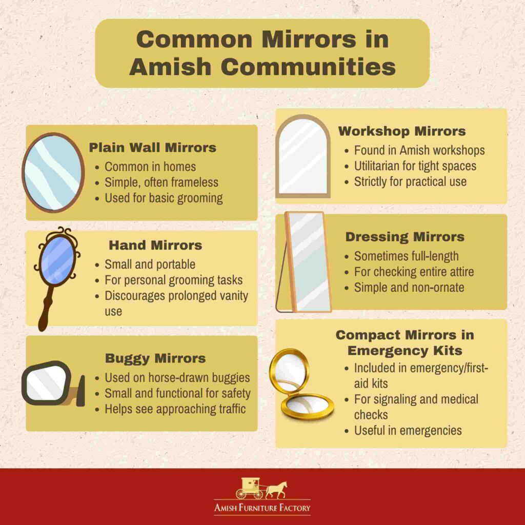 The Amish, known for their simple and modest lifestyle, use mirrors in a manner that aligns with their cultural values. The types of mirrors used by the Amish reflect their emphasis on practicality, functionality, and avoidance of vanity.