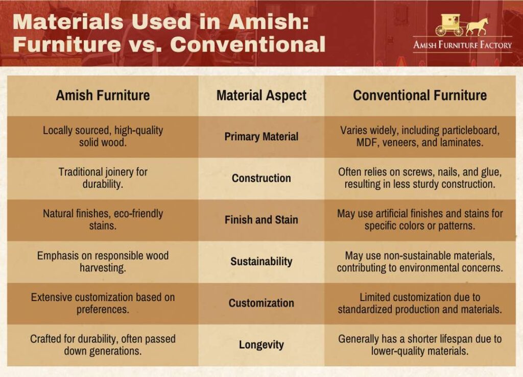 In terms of manufacturing methods, the Amish adhere to traditional techniques that emphasize hand craftsmanship and attention to detail. This ensures a high level of quality and durability in their furniture pieces.