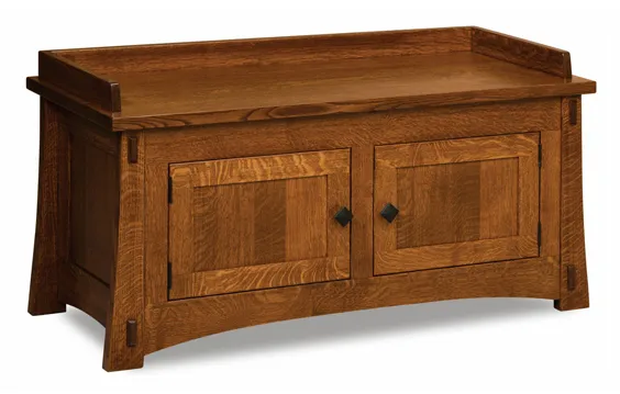 The 2 Door Modesto Bench has a framed seat that doesn't open. Two paneled doors with diamond knobs open in front. The Modesto's legs curve outward from the paneled sides and show off their hardwood construction with exposed mortise joints. Between the feet are arches on all four sides.