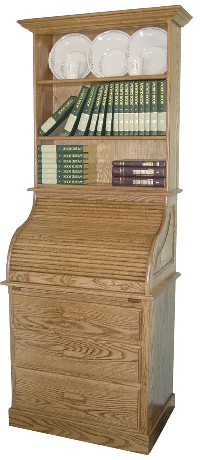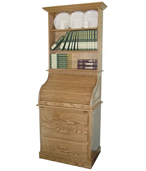 The solid wood construction of this Amish roll top desk ensures it will be a feature of your home for generations to come. This desk has an optional hutch addition to its top. The hutch provides three extra shelves of storage for books, china or other collectibles.