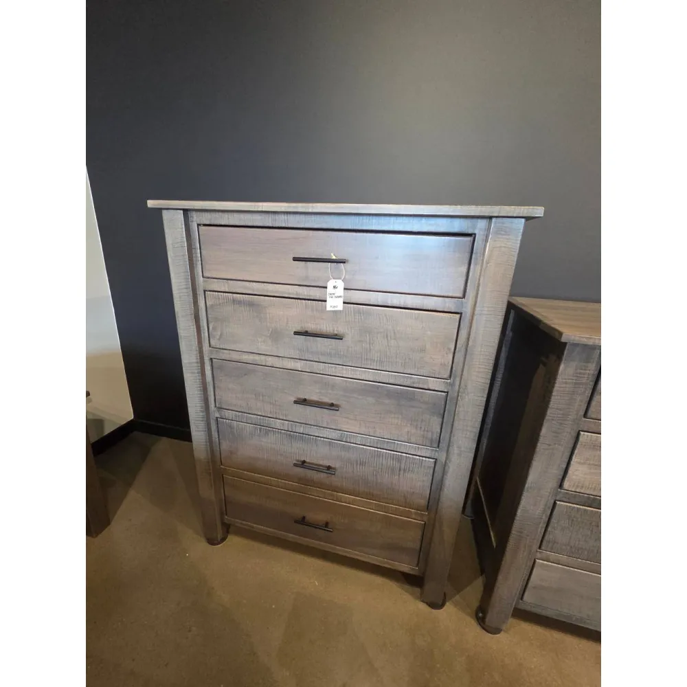 The 5-Drawer Chest is a tall storage container that flawlessly reflects the tough "Antique Slate" style. The chest, which is made by hand from rough-sawn white wood and has five deep, stacked drawers that maximize vertical capacity, is a great option for supplementary storage or smaller spaces. Under a warm, medium-brown stain, the surface maintains the collection's distinctive textured finish, which preserves the thick grain and natural saw marks.