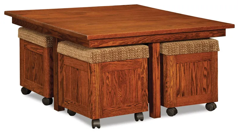 Have a room that could use flexible, additional seating? This wooden table and bench set is easy to move and comfortable. The square wood table is great for popular areas of your house or any room if there is a party. The table also compacts to save space and the benches tuck perfectly underneath it. The four square benches have wheels so you can move them easily while preparing for a get-together or just fun make-shift go-carts for the kids. The plush cushions and storage space under each seat adds comfort and additional storage.