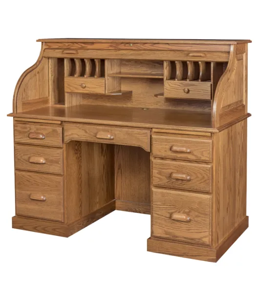 On the 56” wide base, there are three pull-out drawers on either side of the chair area which are perfect for filing paperwork and storing other office supplies. Underneath the roll-top are two additional drawers along with several compartments for more storage. These compartments vary in size and shape to meet all of your needs.