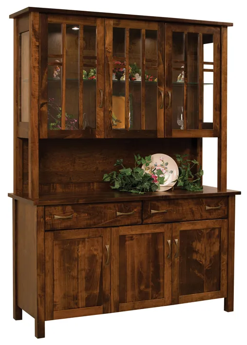 The Amish Acadia mission-style china hutch comes as a highly customizable piece with size options, back options, and door glass options. The hutch is pictured in brown maple with Asbury stain.