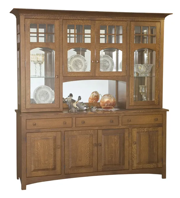 This hutch is beautifully detailed with a rope braid design. The Siesta comes standard with bevel or water glass doors on top. Also available without mitred doors and rope trim. Shown in Quarter Sawn White Oak. Flush doors have trim on back so light does not shine through.