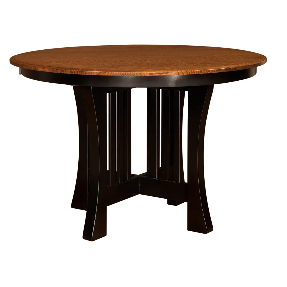 The Arts & Crafts Pub table features gracefully curved legs and mission slats that gives this table it's unique detail and character. It's trestle-leg hybrid design lends extra strength and stability over leg based pub tables. Strength is a desirable feature for a pub table that may see it's share of strength and durability tests through out it's life. The black painted base with stained top is yet another example of the many ways our tables can be custom tailed to suit your design needs. Every table we offer is Amish hand crafted with meticulous attention to detail.