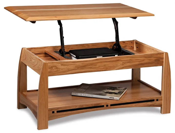 The Boulder Creek 44" Lift Top Coffee Table is the epitome of style and practicality. This coffee table with a lip top is unique because the top lifts up on smooth operating spring hinges that allow for easy access to the entire recess below the top. It's elegant ebony inlays along the fronts and bevel edges really brings this piece together.