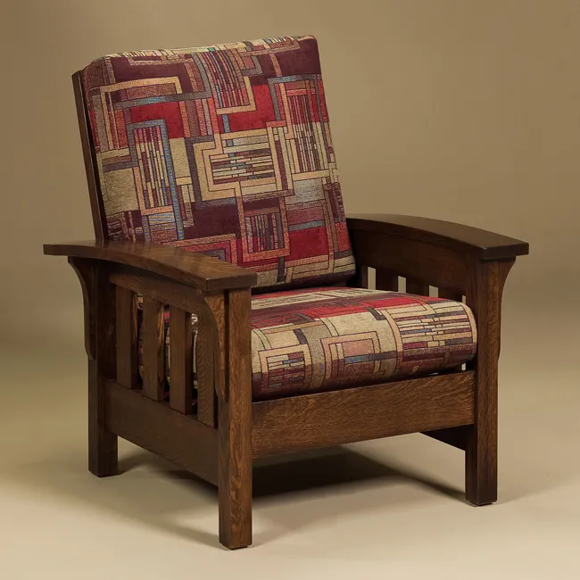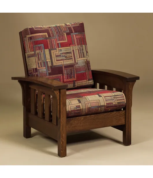 The bowed arm rests of this handsome chair are built for comfort. The chair's solid wood frame supports luxurious cushions, while slats finish the side. This is an heirloom chair that will be comfortable for years to come.