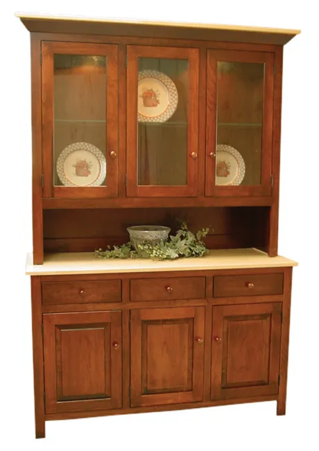 Pictured in a custom two wood, two tone stain combinations - call for pricing on customizations. The hutch in the picture was built in mostly cherry with a hard maple top on the bottom buffet portion. The standard hutch is built in one wood type with one stain color.