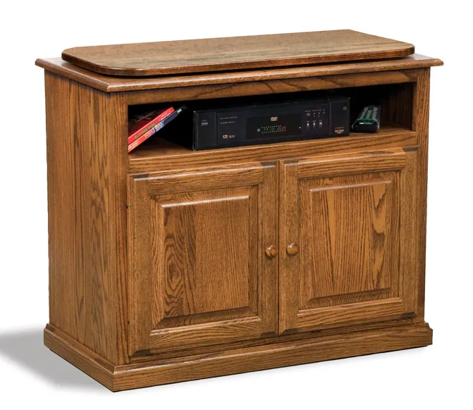 The Classic 2 Door TV Stand features dental trim, classic door panels and bottom trim to give it a contemporary look that win over many style points. This TV stand can be decked out with many features, or can be left in simple form as picture. Adding a smoked or caramel glass doors, a top swivel, and castors. Of course we offer this piece in several hardwoods from which you can choose, as well a many stain colors so you can match you home. The standard features include an adjustable shelf behind the doors, and solid tops and sides.