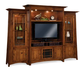The Colbran 4 Piece Large TV Wall Unit is a stunning piece of master craftsmanship that will bring an artful and practical touch to your entertainment room. It's distinct tapered sides and exposed tenons provide it a unique blend of contemporary and traditional Mission style. It's plenty strong, too, with one inch thick beveled tops. This Colbran Wall Unit is also available in just the center unit, without side units.