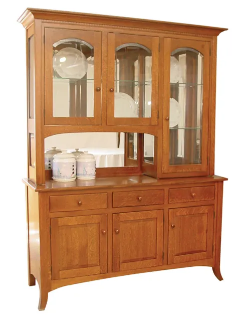 Straight lines with a touch of curved arches define this Shaker hutch. Shown in “Open & Closed” deck. Mirrored back is standard. Flush doors have trim on back so light does not shine through.