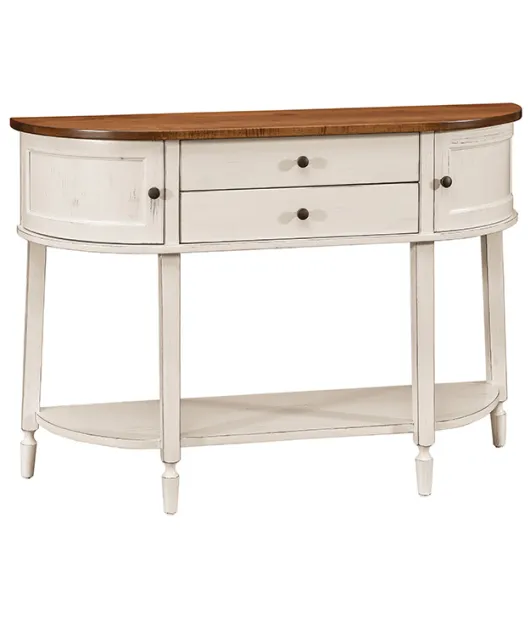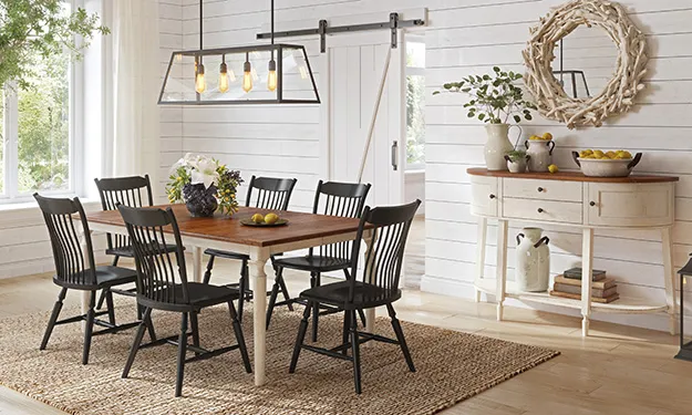 This set features pieces with a custom two-tone finish. Custom finishes must be ordered by phone. The table and server are built in brown maple with FC-41610 Golden Pecan stain top and base with SP168 Weathered Beige stain, while the chairs are in brown maple with Black paint.