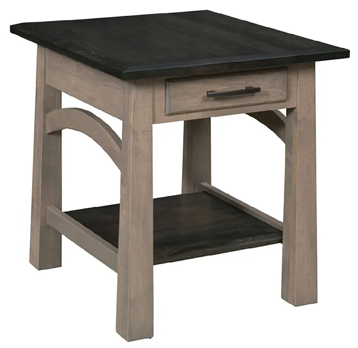 Pictured in brown maple with top and shelf with Dark Knight stain and base in Driftwood finish. Shown here with a custom two tone finish. Custom finishes need to be ordered by phone.Standard Features: