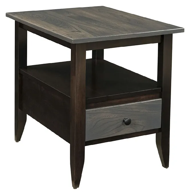 Pictured in elm top and drawers in Antique Slate stain and brown maple base in Onyx stain. Shown here with a custom two tone finish. Custom finishes need to be ordered by phone.
