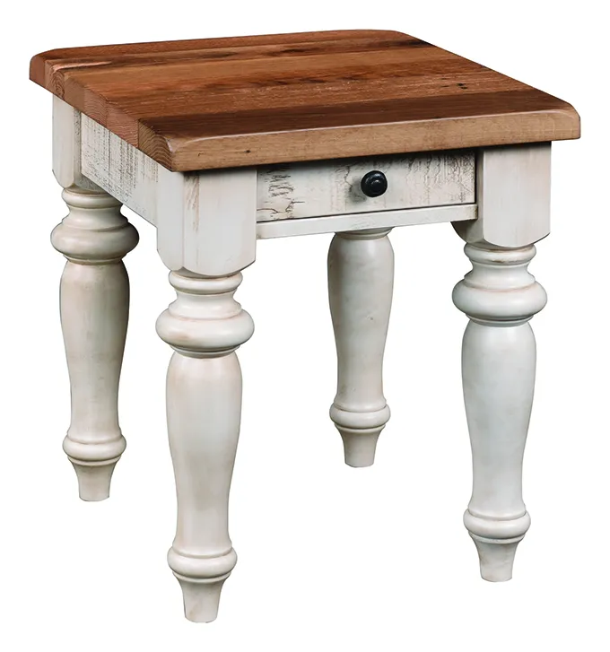 Pictured in reclaimed oak top with Natural stain and base in rustic brown maple base painted in White with WB Glaze finish. Shown here with a custom two tone finish. Custom finishes need to be ordered by phone.
