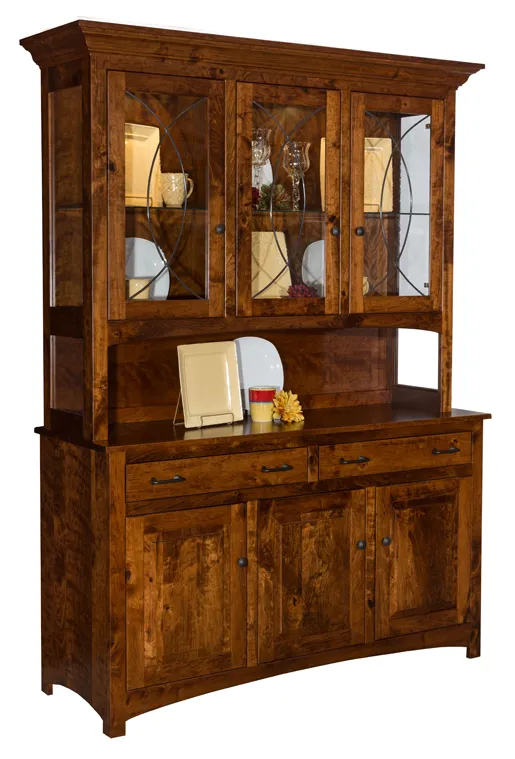 Decorative mullion doors are just one of the fine features in this hutch. Glass panel flush doors have trim on back so light does not shine through. Shown with distressed Old English finish. Available with antique glass.