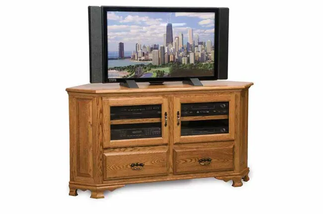 Give your high tech electronic system a worthy resting place with the Heritage-061C 61" Corner TV Stand. The blend of 100% hardwood and high tech is the essence of elegance and sophistication of our day. Heritage pieces feature cathedral raised panel drawers and doors with solid sides, while resting on a Jonie base.