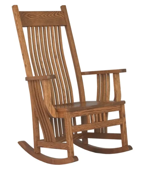 Customize the top of this rocker with either the Royal Mission downward curved top, or flat top (as pictured). You can also choose to have diamond inlays at the top of the chair, or have the top be plain. Can be upholstered, but comes standard with wood seat.