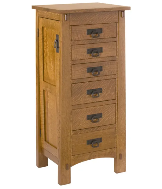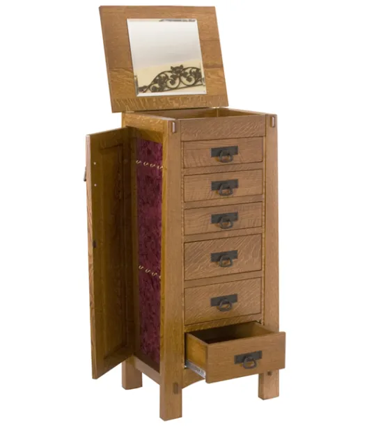 Standing at 43 inches in height and measuring 20 inches in width by 16.25 inches in depth, the Large Modesto Jewelry Armoire offers ample storage without compromising on elegance. Made from premium hardwoods like quarter-sawn white oak, this stately armoire ensures long-lasting use and adds a touch of sophistication to any bedroom.