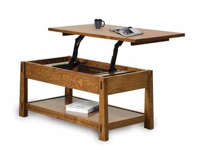 The Modesto Lift Top Coffee Table has a unique lift top with a counter weight and distinctly tapered legs that are a trait of the Modesto style. This table fits in great with many Amish furniture styles and emboldens any room when standing alone, or with additional Modesto pieces in a set. Not only is this style bold an elegant, it gives pieces plenty of strength. This coffee table can be built in four different wood types. Each wood type can have a few different stains applied that result in unique colors and grain lines to arrive at the just the look you are looking for.