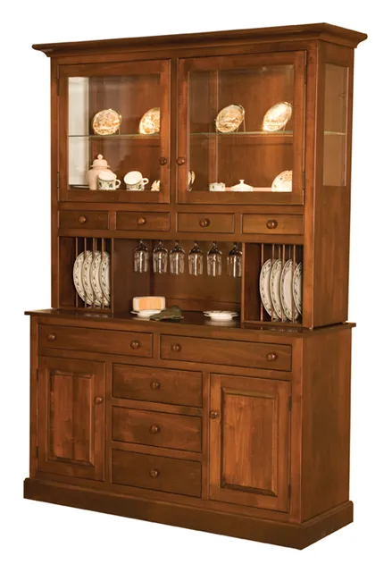 This hutch features large beveled glass doors on top along with 4 small wood drawers for storing linens or flatware. The open deck with wine glass holders leaves room to prepare drinks or serve food.
