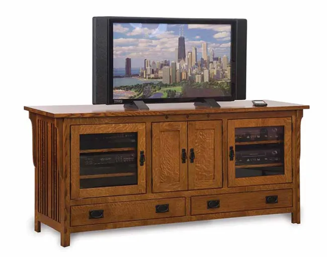 Features double doors with two triple trays in the center. The trays hold 162 CD's, 126 DVD's, or 72 VHS cassettes. Comes standard with Black Mission hardware -other hardware options are available for ordering. Solid or reverse panel sides are available as an alternative to slat sides.