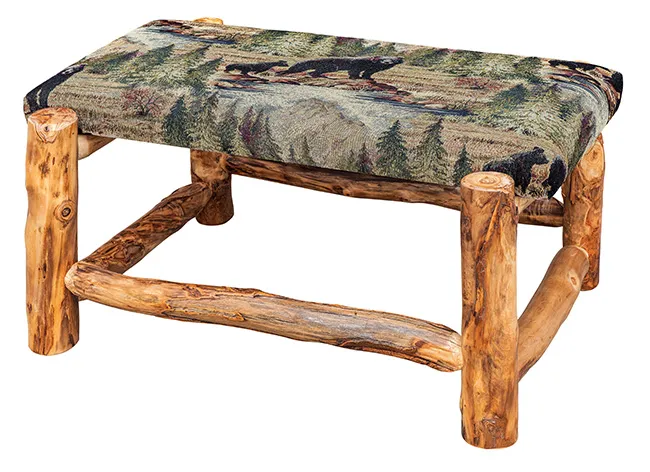 The pictured Fireside Rustic Ottoman with Fabric Top is built in aspen with natural finish and Bradley Fabric.