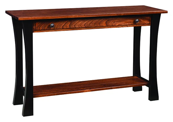 Pictured in brown maple case with OCS-230 Onyx stain, the top, drawer and shelf in elm with OCS-113 Michael's Cherry stain. The Cove TV Stand is shown here