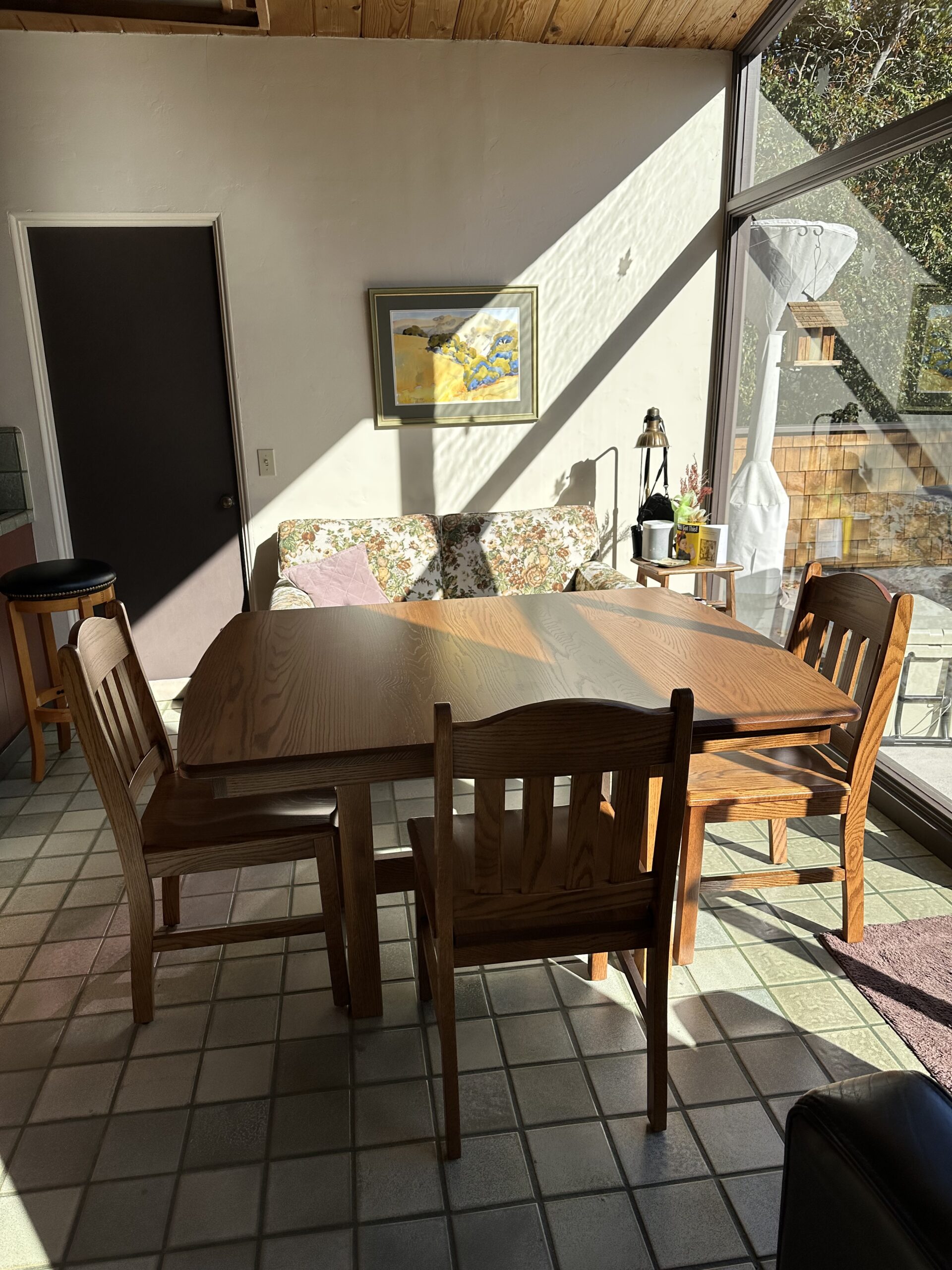 There is no standard when it comes to selecting your dining chairs, it is all down to personal preference. While there is nothing wrong with a perfectly matched dining table and chair set, some might consider it a bit too formal. Just remember the style you are trying to achieve. We at Amish Furniture offer a wide range of options for you to choose from. Jean ordered Adams Dining Chairs, Sheridan Trestle Dining Table in oak and Acorn Dining Chair in brown maple all with FC-N3176 Malaguania finish.
