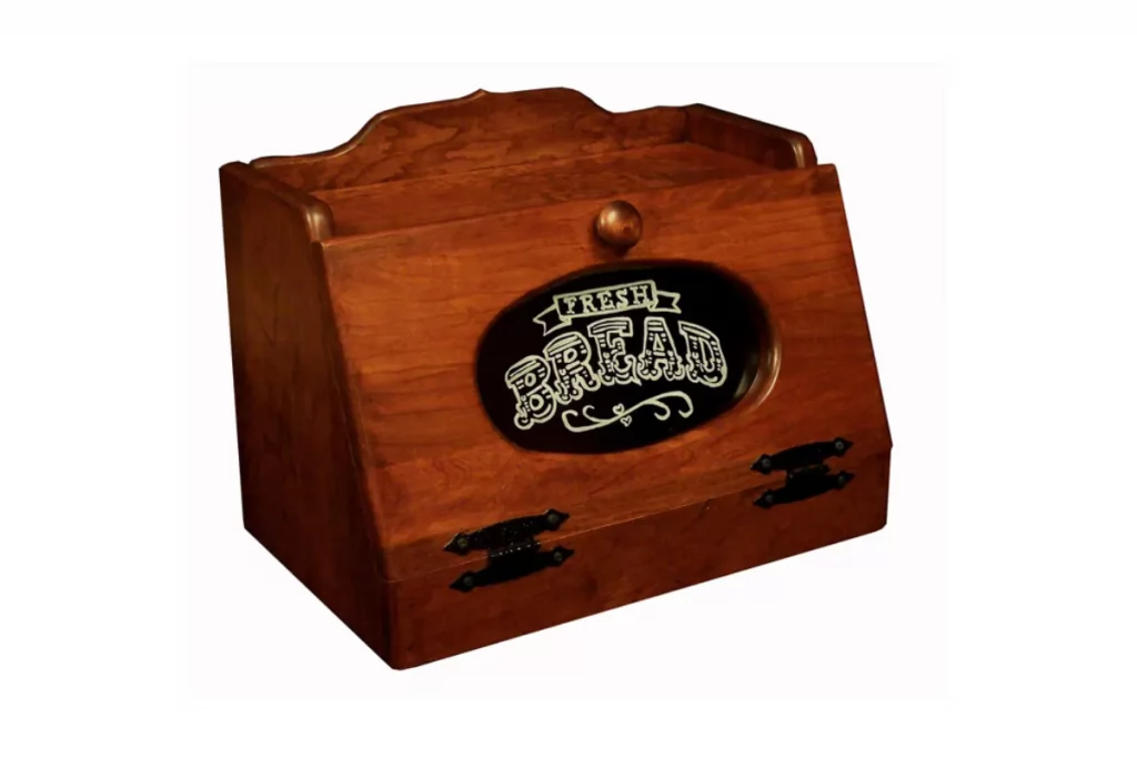 This bread box combines the functional design and solid construction of Amish furniture with a nod to the practical elegance of the 1920s. Its plexiglass front adds a modern twist to a classic piece.