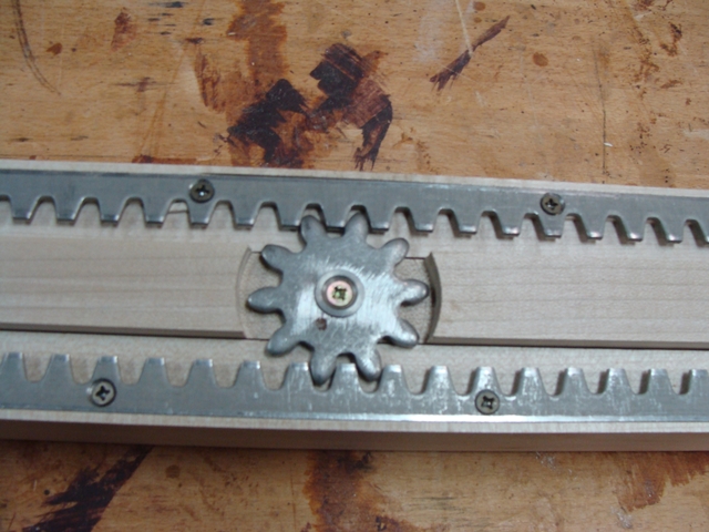 A geared slide operates with two wood rails sliding in opposite directions that are each guided and supported by metal gears and metal rails.