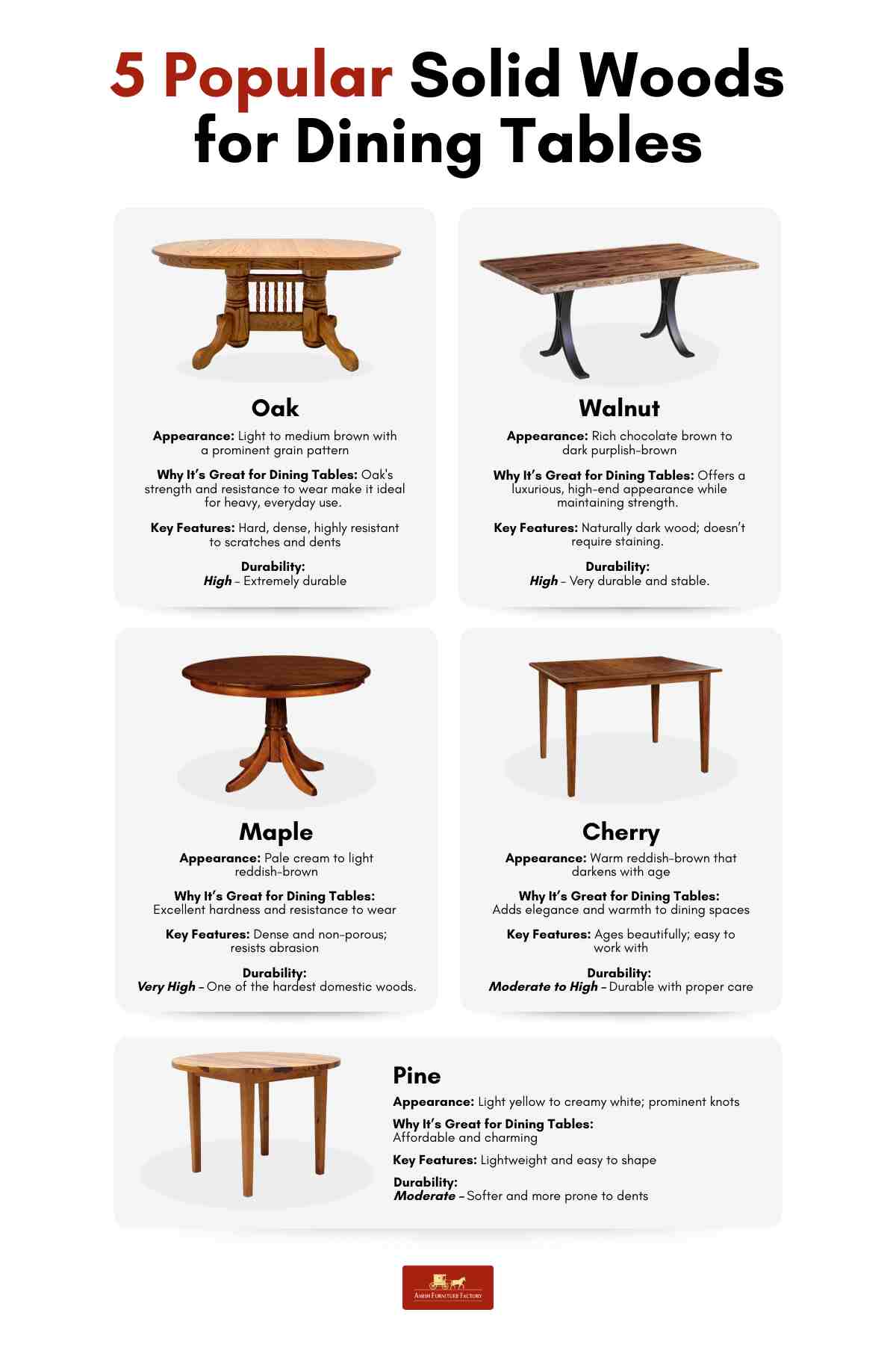 - Solid wood such as oak, walnut, maple, cherry, and pine stands out as the best material for dining tables.