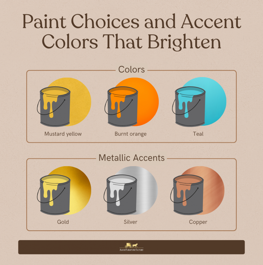 Using color strategically is crucial when trying to brighten a room with dark furniture. Here’s how paint choices and accent colors can make a difference.