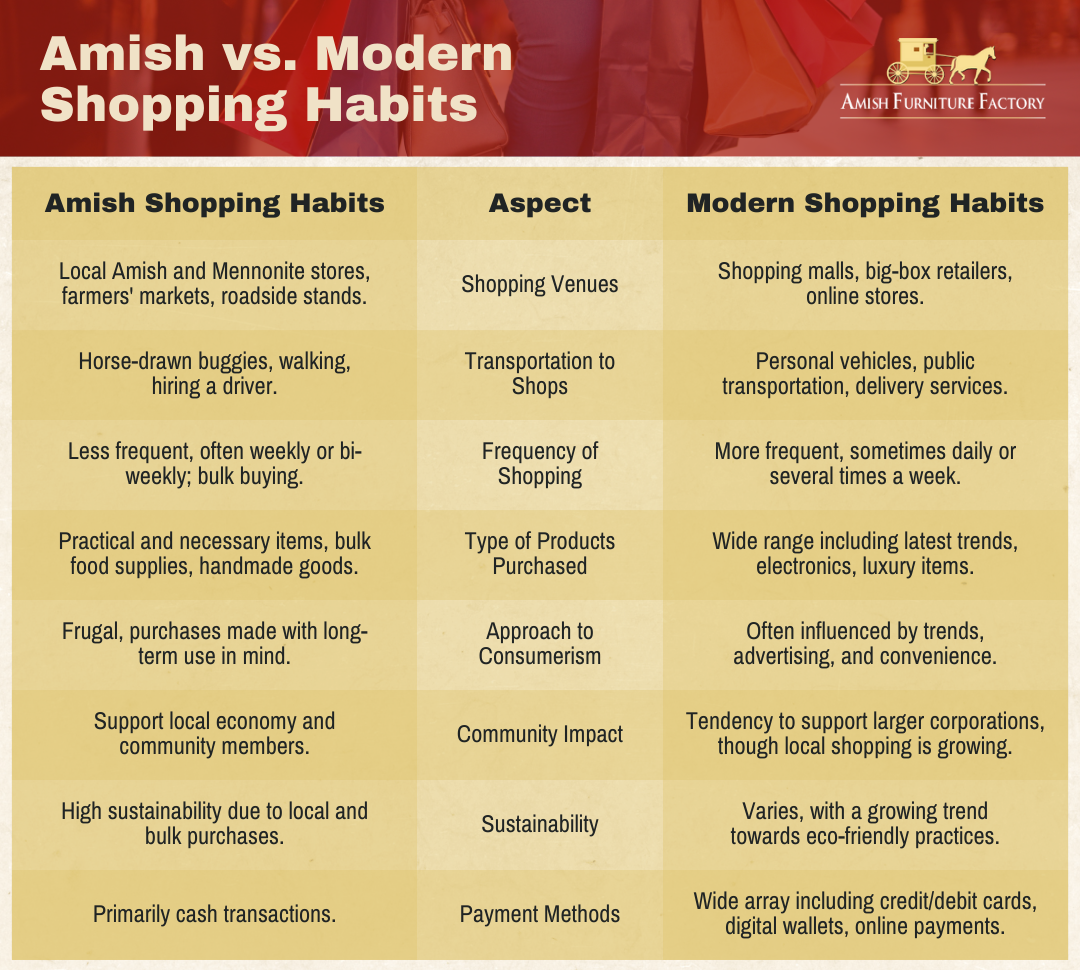 Below, you’ll see the differences between Amish and modern shopping habits: