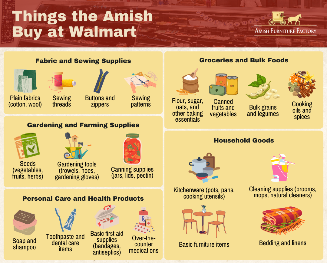 Given their agrarian lifestyle, the Amish might purchase gardening tools, seeds, and farming supplies from Walmart.
