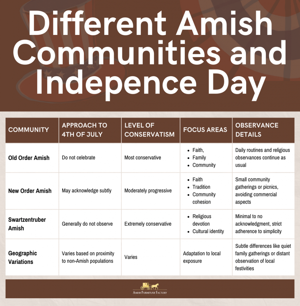 Some Amish communities might observe the holiday in ways that fit their values, such as picnics or small gatherings, which are devoid of overt patriotic displays. This reflects their ability to adapt certain aspects of the holiday while maintaining cultural integrity.