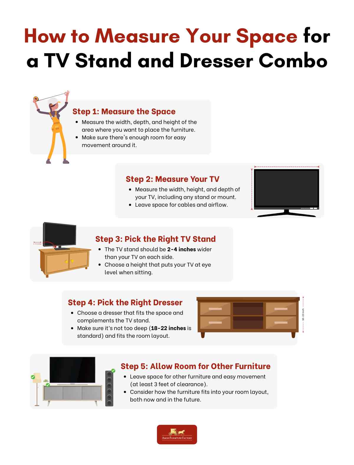 Before buying a dresser and TV stand combo, take some time to measure the space where you plan to put it. Check the width, depth, and height to make sure there’s enough room for the furniture and easy movement around it. Think about how people will move through the room, so the combo doesn’t block pathways. Also, double-check the dimensions of the TV stand to make sure it fits your TV’s size and weight.