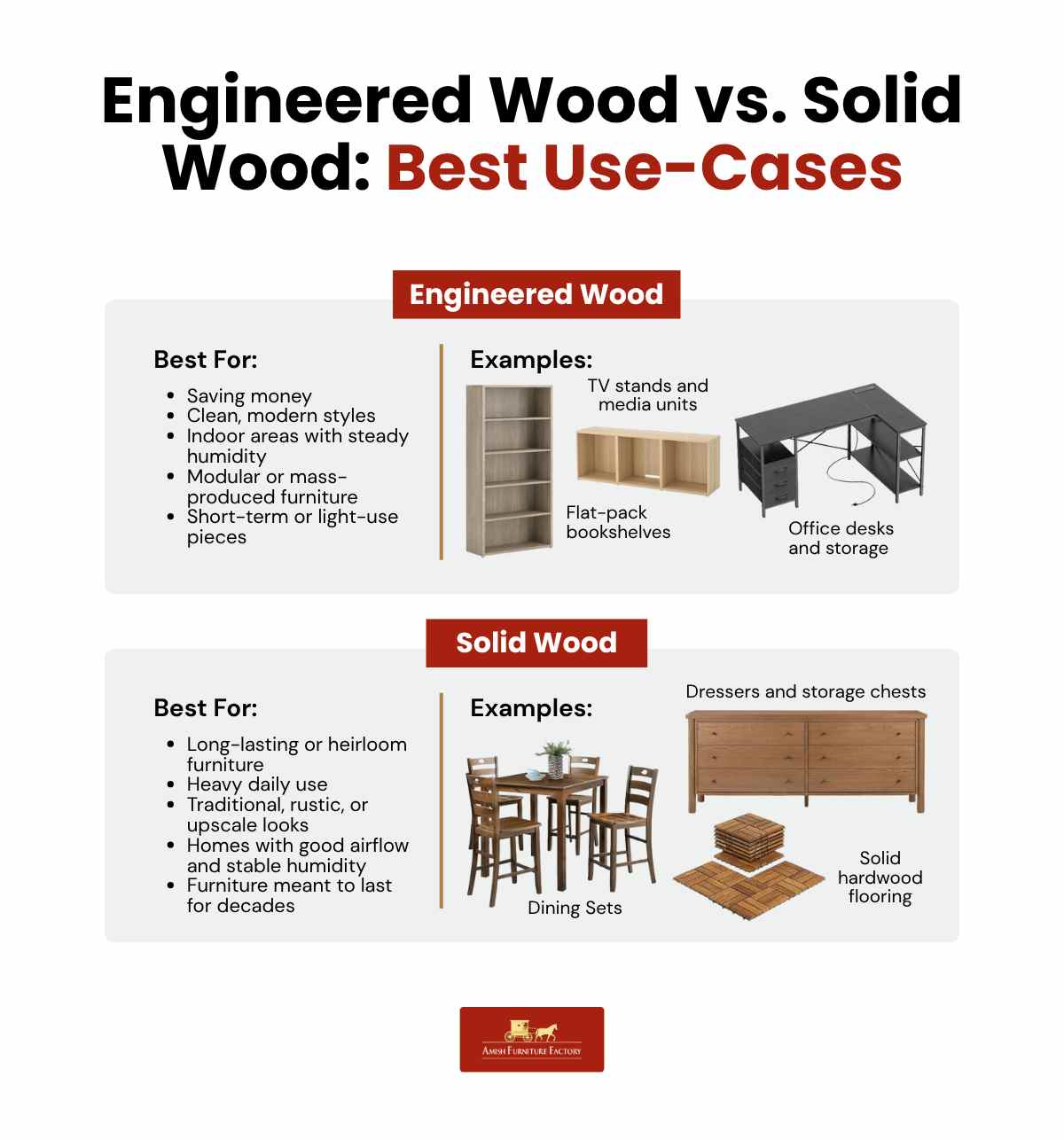 Engineered wood works well for pieces that need to be lightweight, budget-friendly, or easy to move—like bookshelves, TV stands, or desks. It’s also a smart pick in areas where moisture might be an issue, such as basements or humid climates, since it’s less likely to warp than solid wood. While it might not last as long, it’s versatile and often easier on your wallet.