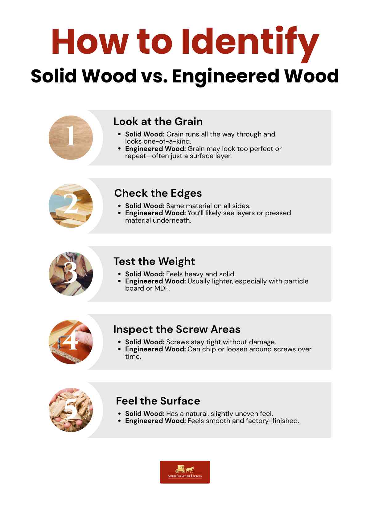 Knowing the difference between solid wood and engineered wood helps you make a smarter choice. Solid wood shows continuous grain along the edges and has natural variations in color and pattern throughout the piece. On the other hand, engineered wood often shows layers at the edges, like plywood or pressed wood beneath a thin veneer. The surface may have a repeating grain pattern, and it usually feels lighter than solid wood.