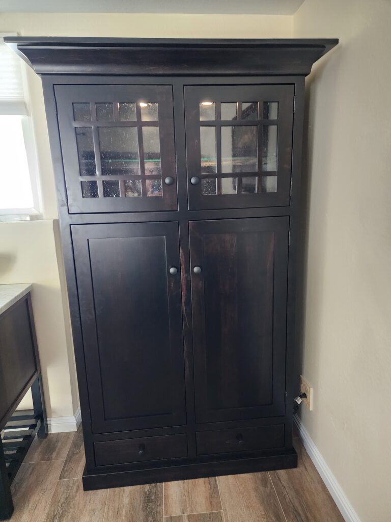I received my Amish Furniture Factory cabinet recently. I absolutely love it and couldn’t be happier. I had originally looked into getting custom cabinets made by a local cabinet maker for my bedroom/bathroom remodel. The quote was very expensive and I wasn’t happy with how it went so I started searching for ready-made furniture. I wanted to buy furniture made in the USA if at all possible. Something told me to try Amish furniture because I had heard how well-made it is. I found Amish Furniture Factory on the internet and began searching their catalog. I found the Norwest Pantry which would fit very well in my space. I am actually using it in a clothes cabinet. I corresponded with Laura who was extremely knowledgeable and helpful. I was able to get a sample of the Ebony black stain on brown maple which Laura recommended. It has just a bit of wood grain which shows thru and I like the way it looks very much. It is so sturdy and well-made. All the doors and drawers open and close perfectly. It has touch lights at the top which is a nice feature. I was able to take advantage of the customization options for shelves and drawers, knobs, glass, etc. It was ready and delivered in the time frame I was told. It was all very well organized and communication was clear all along. The white glove delivery was very reasonable and well done. The delivery people were polite, and professional, and did a great job. I am extremely happy with my purchase and it was far less than custom cabinets would have been and has more features, plus hopefully, it will stay in my family for many generations. I highly recommend Amish Furniture Factory.