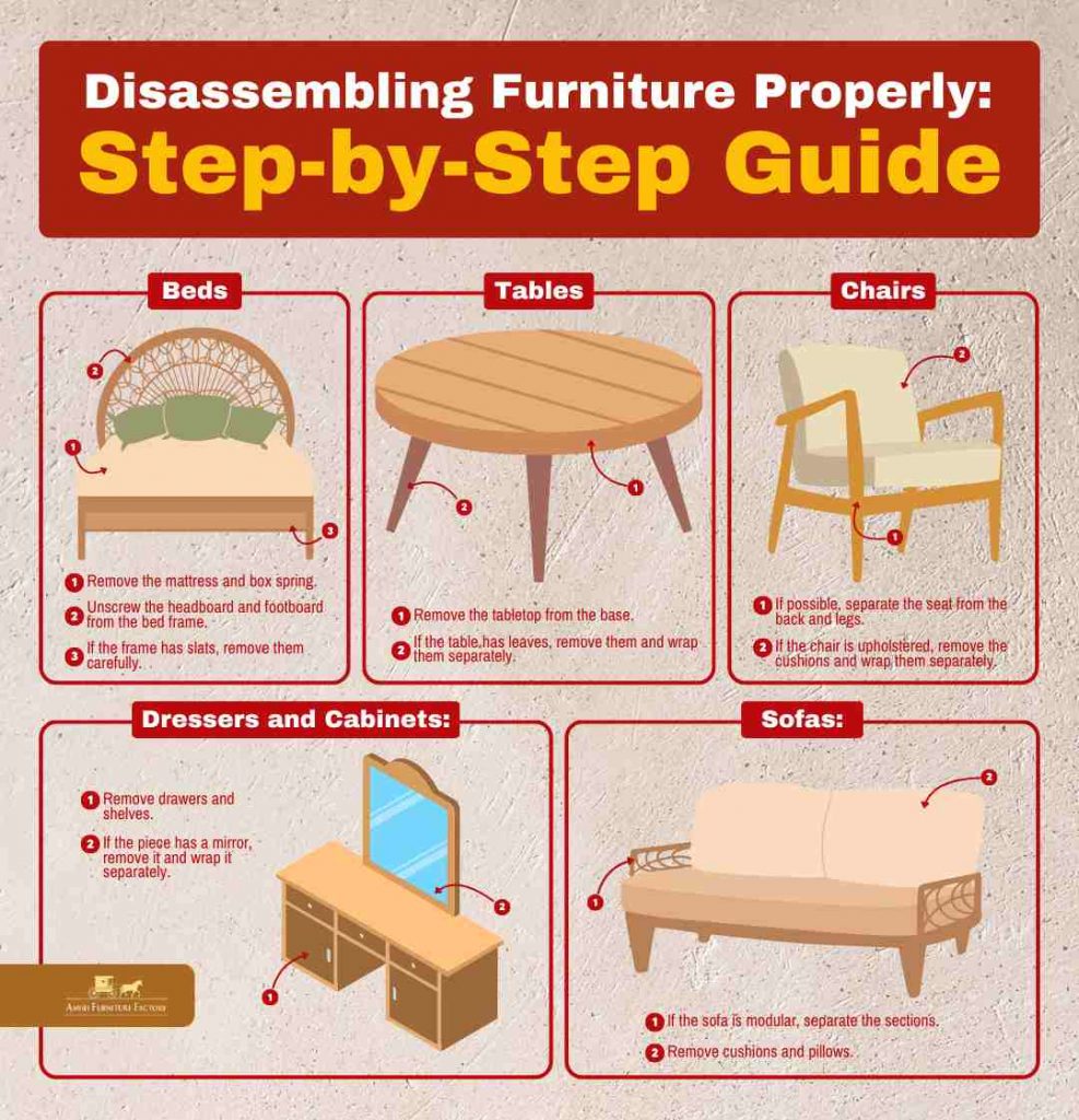 Disassembling large or complex furniture pieces before a move can significantly reduce the risk of damage during transport. It also makes it easier to maneuver furniture through doorways and hallways. Here’s a step-by-step guide on how to disassemble common types of furniture: