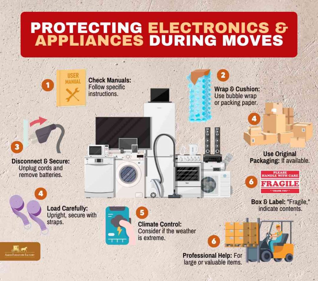 Moving electronics and appliances requires extra caution due to their delicate internal components and sensitivity to impacts. Here’s how to ensure their safe transport: