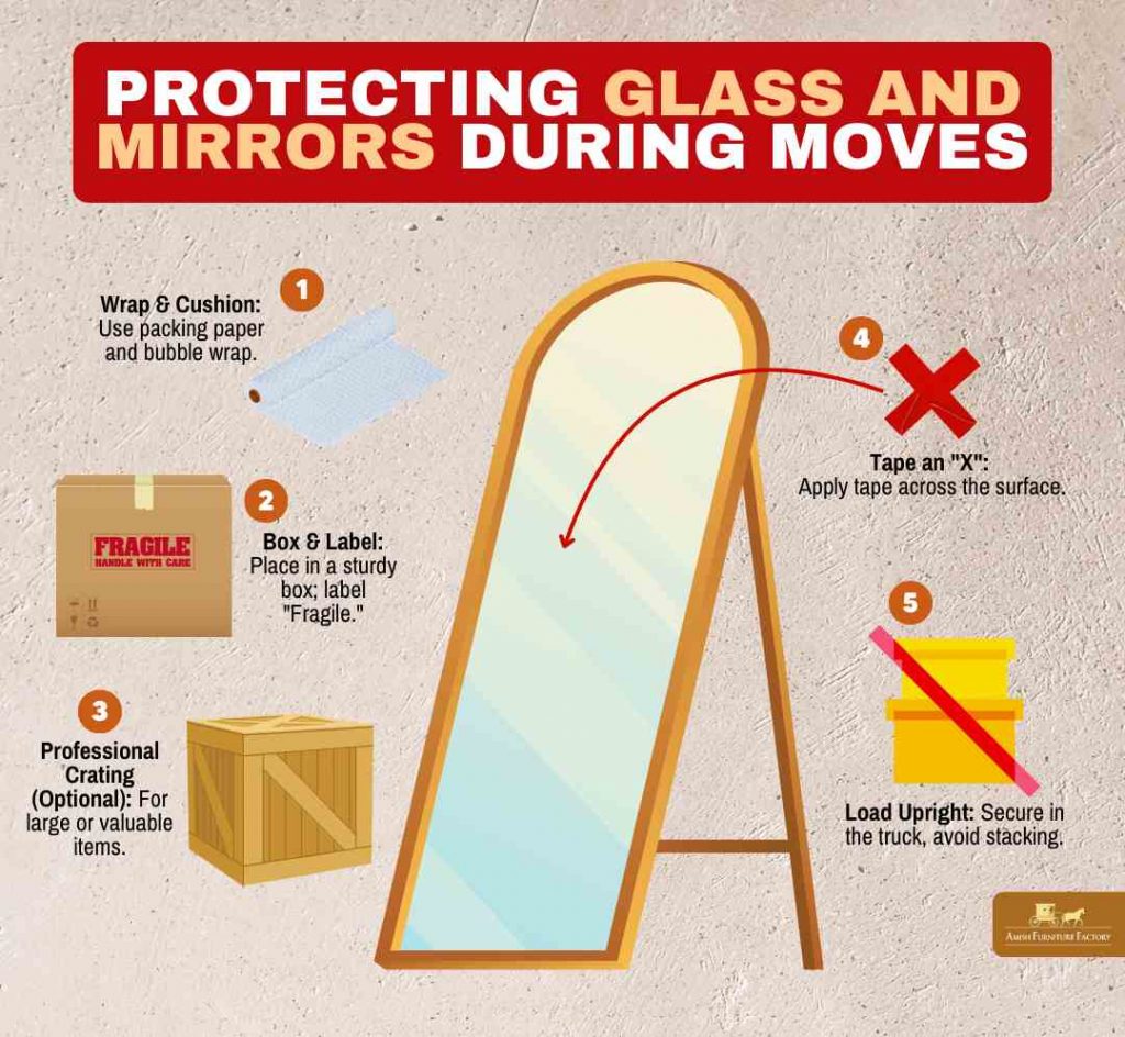Glass tabletops, mirrors, and other glass elements are among the most fragile items in a home, making them highly susceptible to damage during a move. To prevent cracks, chips, or shattering, follow these precautions: