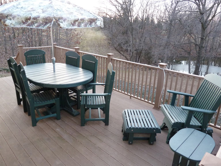 Keith Dimmitt from Oak Slope Designs shared photos of his new poly-vinyl outdoor set. When summer arrives and those trees are in bloom the dark green color will blend in beautifully with the natural surroundings. People are often surprised that the Amish make furniture from post-consumer products but the idea ties in beautifully with their practice of building high quality furniture from natural and sustainable materials. You can be assured that the same quality craftsmanship and attention to detail that our wood furniture receives is applied to our poly-vinyl line as well.