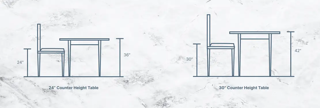 Starting with the basics, the typical height for a dining chair seat ranges between 17″ to 19″. For bar stools, we have two primary heights available: 24″ and 30″. To determine which height is right for you, consider your counter’s height. If your counter measures 36″ in height, the 24″ stool would be ideal, and for a 42″ counter, you’d want to opt for the 30″ stool.