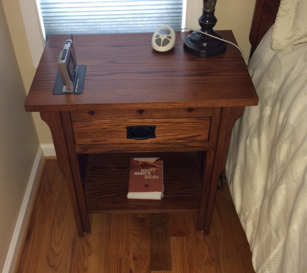 David and Angela have a new nightstand. Their Royal Mission 1-Drawer Slat Nightstand is oak with Old World Mission stain and a custom height. For David, it was a solid choice.