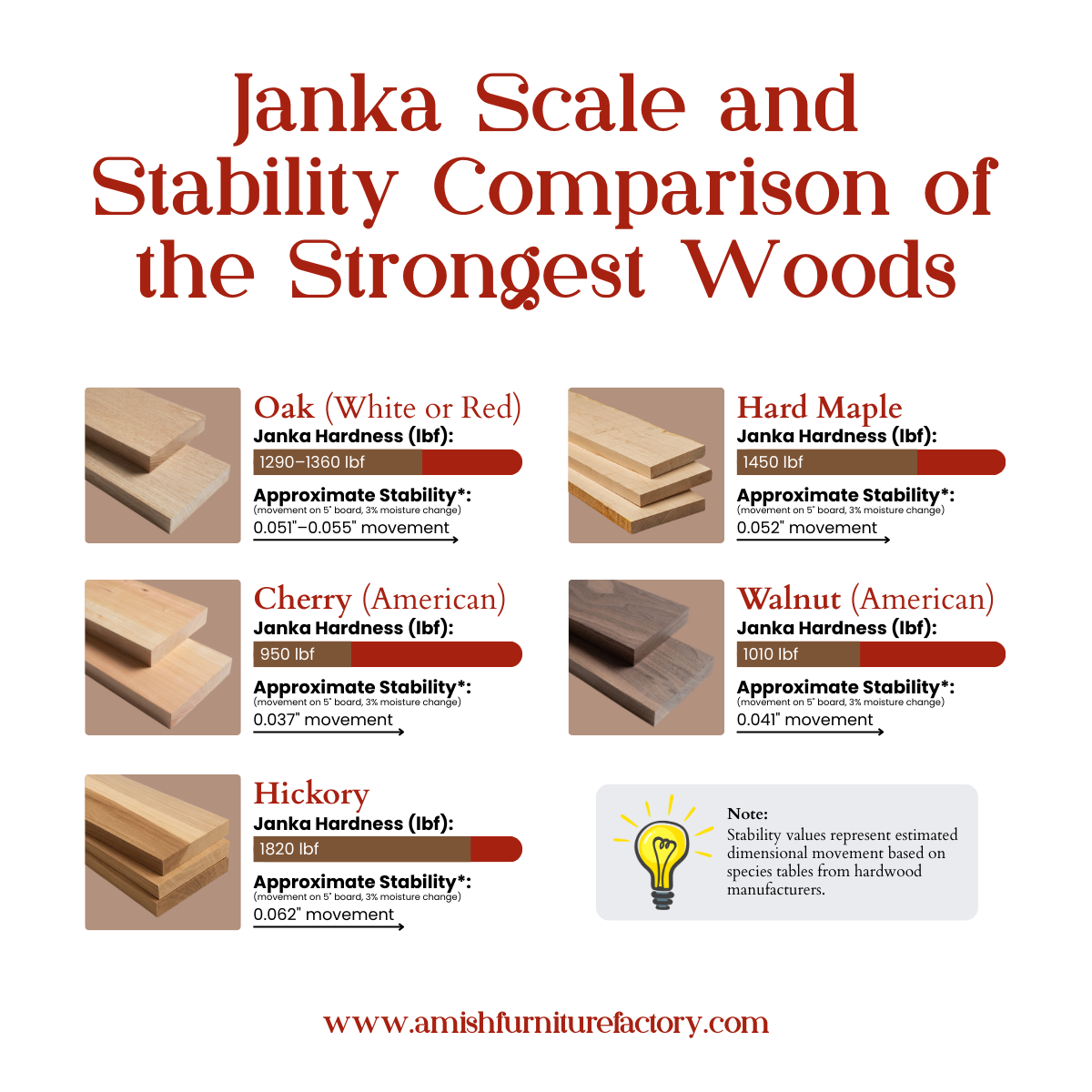 - The strongest woods commonly used in Amish furniture are oak, hard maple, walnut, cherry, and hickory.