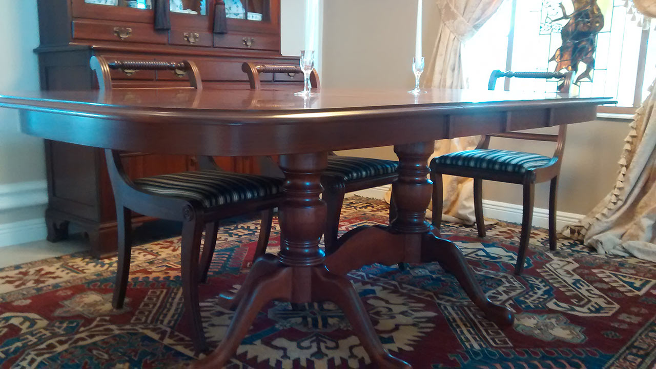 Jack Granzow of Wellington, Florida, has sent us pictures of his new dining table. The Granzows ordered the Princeton Dining Table in cherry with the classic cherry stain. The banquet shape and the traditional, curvy double pedestal make the table a joyous fit for the traditional theme and bohemian undertones of the Granzows’ dining room.